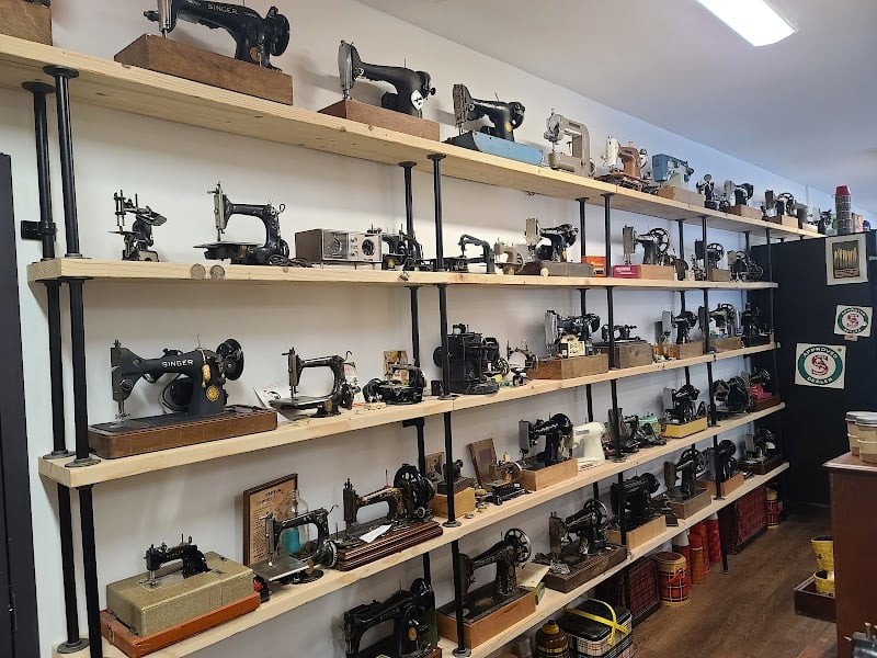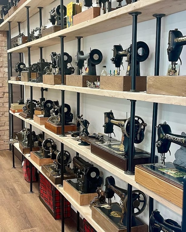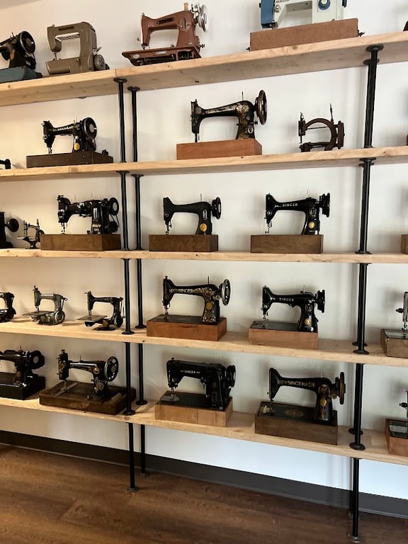 The image showcases a display of vintage sewing machines arranged on wooden shelves in a sewing store.