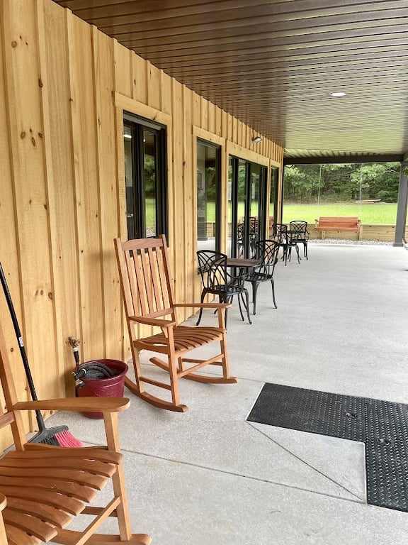 The image shows a welcoming outdoor seating area at The Sew'n Place, featuring wooden rocking chairs and black metal tables.