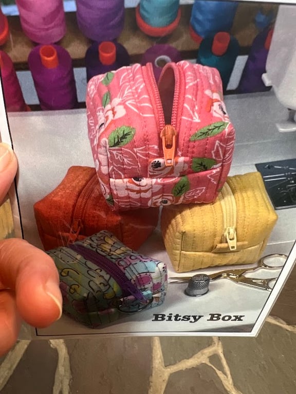 The image features colorful Bitsy Boxes in various patterns, displayed prominently in a sewing store.