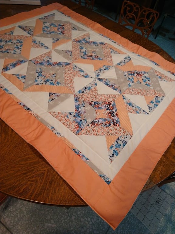 A beautifully crafted quilt featuring a geometric pattern in pastel colors, including floral and solid fabrics, is displayed on a wooden table.