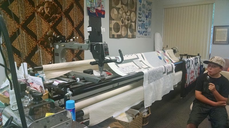 The image shows the interior of The Quilting Needle sewing store, featuring a longarm quilting machine surrounded by various fabrics and quilting supplies.