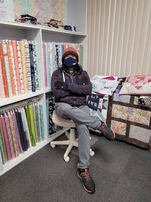 A seated individual in a cozy sewing store surrounded by colorful fabric rolls on shelves and neatly folded quilts on display. The warm atmosphere invites creativity and crafting.