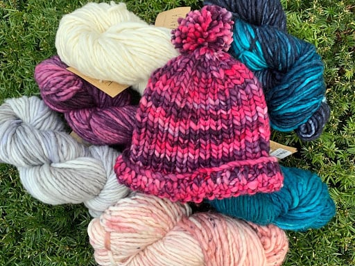 A vibrant pink and purple knitted hat sits atop a colorful assortment of yarn skeins in various shades, including white, gray, and teal.