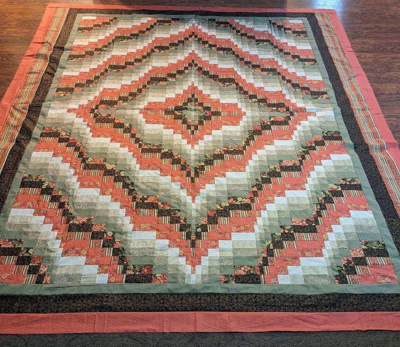 A vibrant quilt featuring a chevron pattern in shades of coral, green, and black is displayed on a wooden floor.