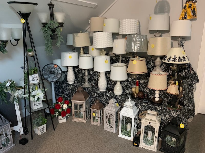 The image showcases a cozy interior of Lantz Homestead Quilt Barn, featuring an array of decorative lamps and lanterns displayed on a black floral tablecloth.