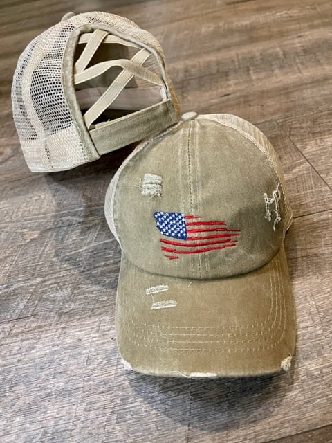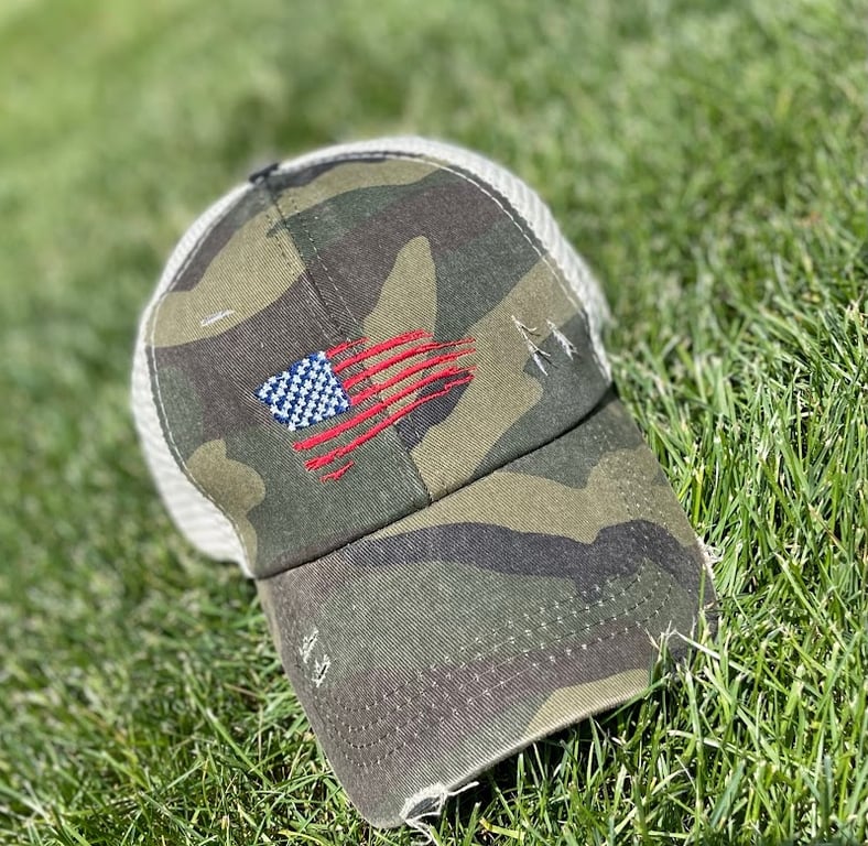 A camo baseball cap rests on green grass, featuring a distressed design with an embroidered American flag.
