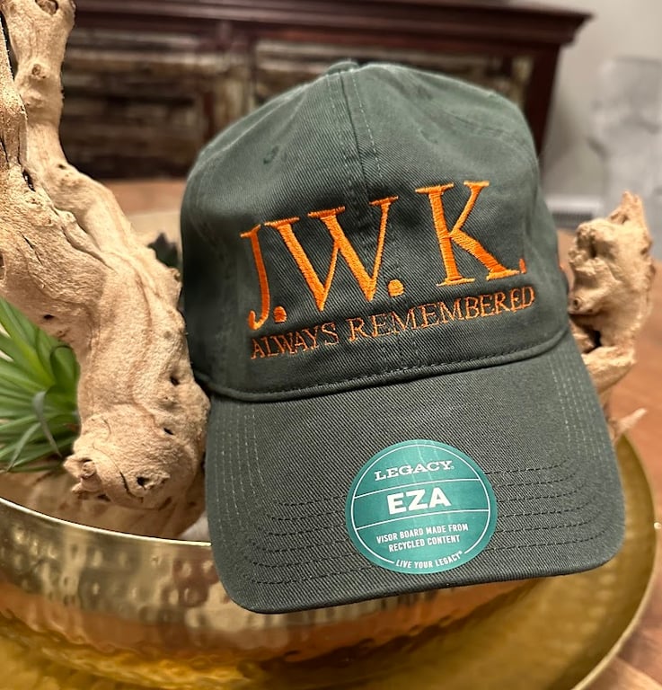 A green cap with "J.W.K. ALWAYS REMEMBERED" embroidered in orange sits on a decorative gold bowl.
