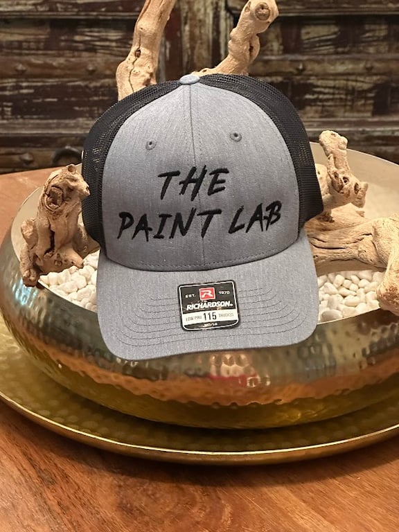 A stylish gray and black cap with "THE PAINT LAB" embroidered sits on a decorative gold bowl filled with pebbles.