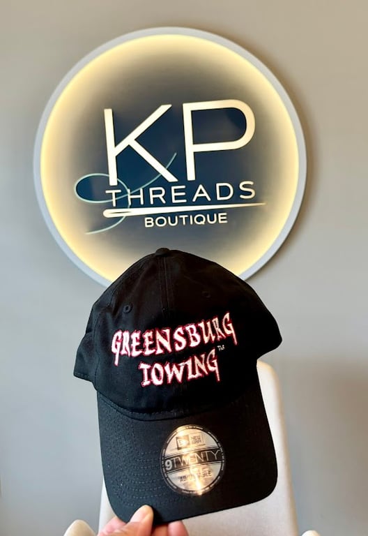 A person holds a black cap with "GREENSBURG TOWING" embroidered in red, in front of the illuminated KP Threads Boutique sign.