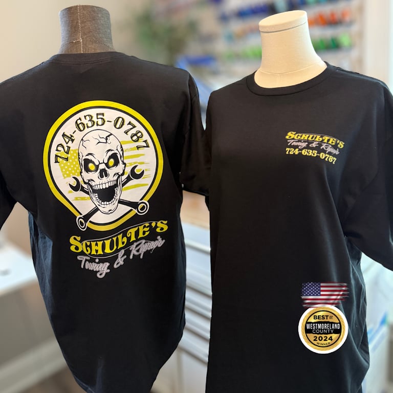 The image features two black t-shirts displayed on mannequins, showcasing a bold skull graphic and text for Schulte's Tuning & Repair.