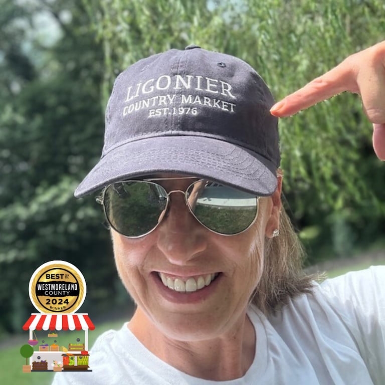 The image features a smiling woman wearing sunglasses and a cap that reads "Ligonier Country Market." She is outdoors, pointing at her hat, with greenery in the background.