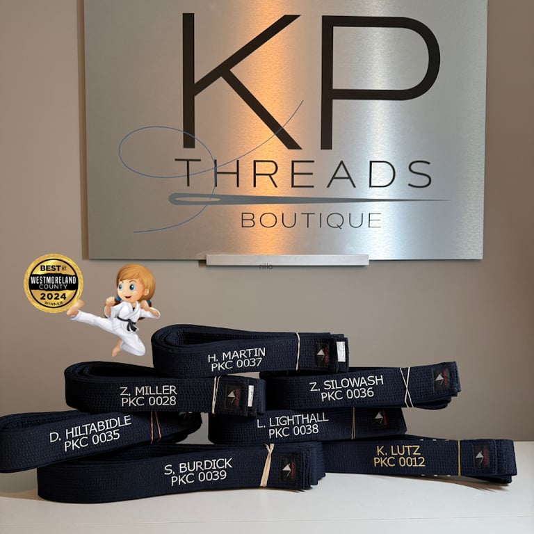 The image showcases a display at KP Threads Boutique, featuring neatly stacked dark fabric belts labeled with names and identification numbers.