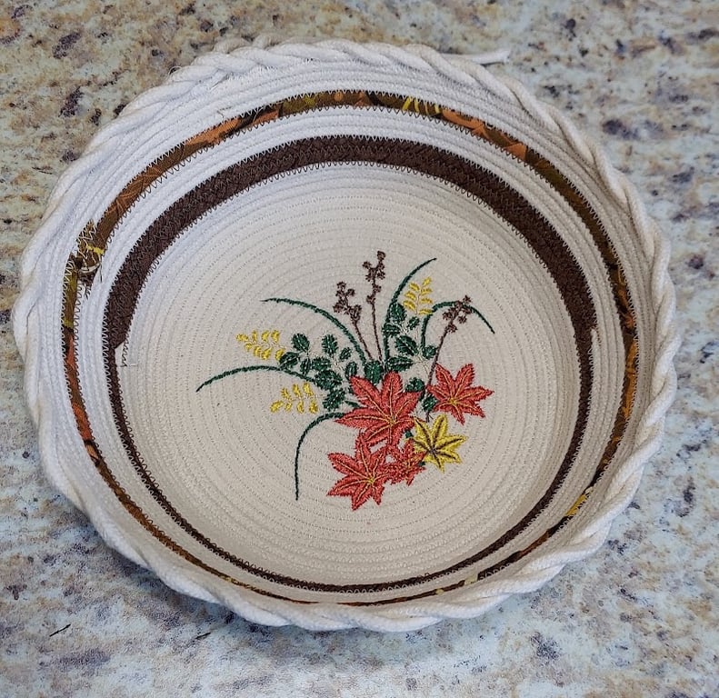 A handcrafted fabric bowl features intricate embroidery of colorful autumn leaves. The bowl's braided edge adds a decorative touch, showcasing the artistry of sewing and crafting.