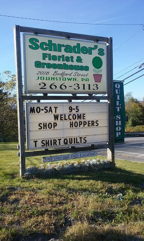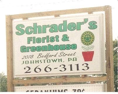 The image features a sign for Schrader's Florist & Greenhouse, displaying the store's name and contact information.