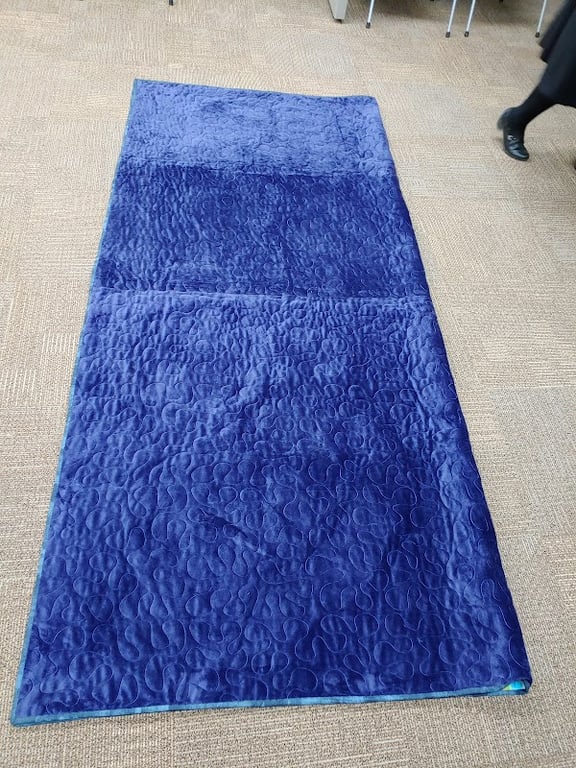 A large, quilted navy fabric is displayed on the floor of Schrader's Fabrics by Barb, showcasing its textured surface.