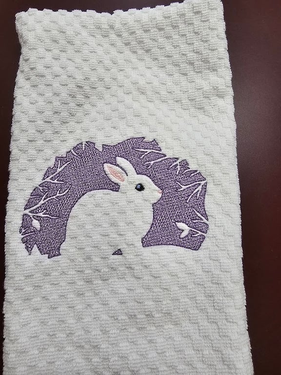 The image features a textured white fabric towel adorned with an embroidered design of a white rabbit surrounded by a purple floral wreath.