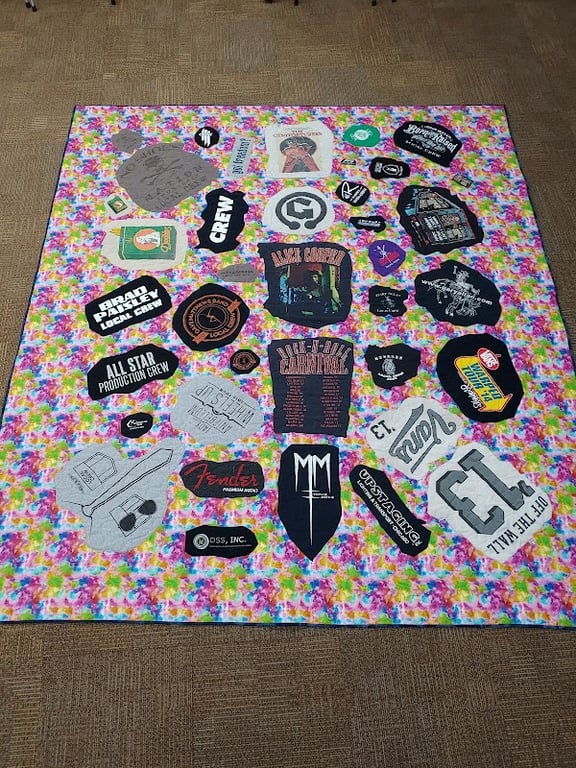 The image showcases a vibrant quilt made from various fabric patches featuring logos and designs, set against a colorful floral background.