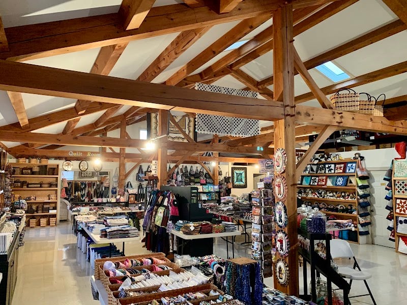 The interior of Riehl's Quilts & Crafts features wooden beams and shelves filled with colorful fabrics, quilting supplies, and craft items.