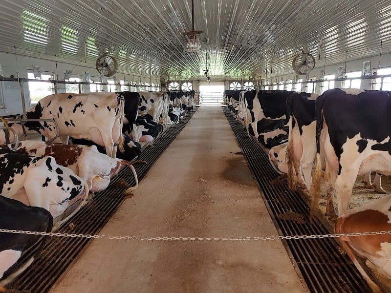 The image shows a spacious dairy barn with rows of cows resting in stalls. The interior features metal fans and large windows for ventilation, creating a bright environment.