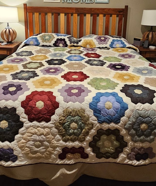 A colorful quilt featuring hexagonal floral patterns covers a bed in a cozy room.