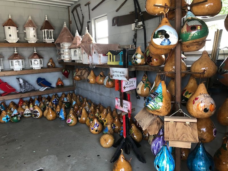The image showcases a charming interior of Riehl's Quilts & Crafts, featuring colorful, hand-painted gourds and decorative birdhouses displayed on wooden shelves.