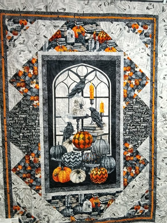 This image showcases a beautifully crafted quilt featuring a Halloween theme, with crows, pumpkins, and candles.