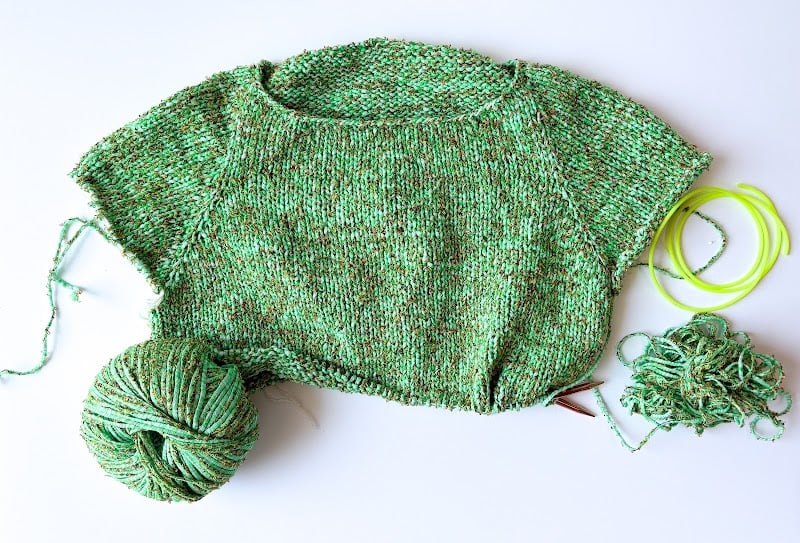 A partially knitted green sweater is displayed alongside a ball of yarn and loose strands. The vibrant colors and textures highlight the creativity of sewing and knitting projects.
