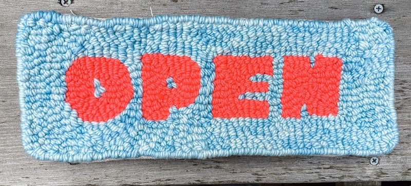 A handmade "OPEN" sign features bold red letters on a light blue background, showcasing the welcoming atmosphere of the Homesewn sewing store.