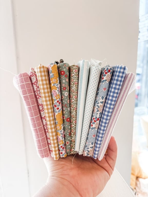 A hand holds a vibrant assortment of fabric bundles in various patterns and colors, showcasing the selection available at Homesewn, a sewing store.