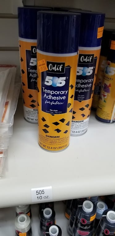 The image shows several cans of Odif 505 Temporary Adhesive for fabric displayed on a shelf in a sewing store.