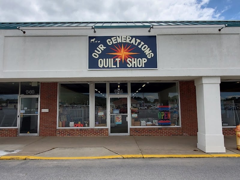 The image shows the exterior of Our Generations Quilt Shop, featuring a welcoming storefront with a bright sign.
