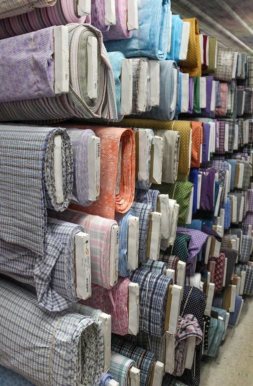 The image showcases a vibrant display of neatly rolled fabrics in various colors and patterns, including checks and polka dots, stacked on shelves in a sewing store.