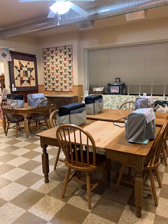 The image shows a cozy sewing studio with wooden tables surrounded by sewing machine bags. Colorful quilts adorn the walls, creating an inviting atmosphere for crafting activities.