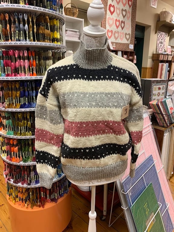 A cozy, striped sweater is displayed on a mannequin in Humble Stitch, surrounded by colorful sewing supplies and fabrics on shelves.