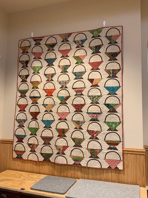 The image showcases a vibrant quilt featuring a basket pattern, displayed prominently on a wall in Humble Stitch sewing store.