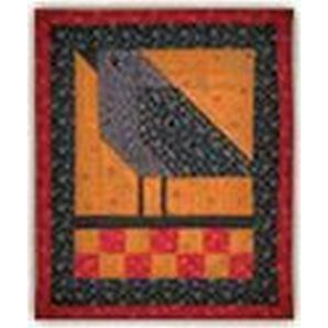 The image features a vibrant quilt showcasing a stylized bird design in shades of gray and orange, framed by a black and red border.