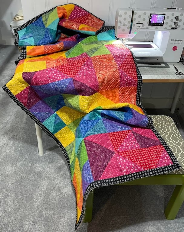 A vibrant quilt featuring colorful geometric patterns drapes over a table next to a sewing machine in a cozy sewing store.