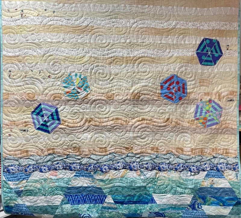 This image features a beautifully crafted quilt displayed in a sewing store, showcasing intricate patterns of waves and colorful geometric shapes.