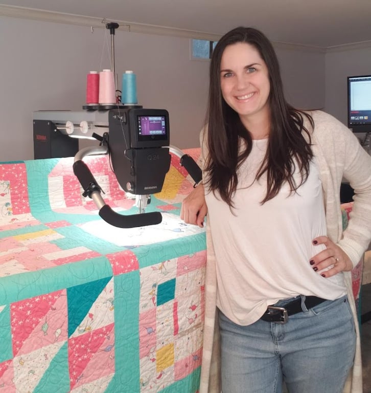 A smiling woman stands beside a colorful quilt on a longarm quilting machine in a cozy sewing store. The interior features shelves filled with various fabrics and sewing supplies.