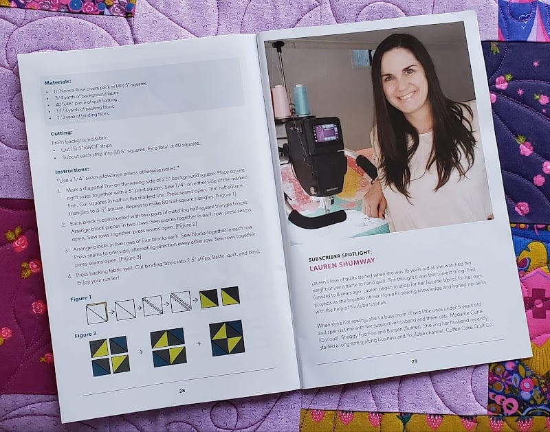 The image features a sewing magazine open to a page with quilting instructions and a profile of Lauren Shumway, a quilter.