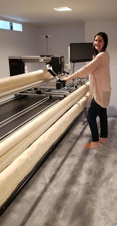 A woman operates a longarm quilting machine in a well-lit sewing studio.