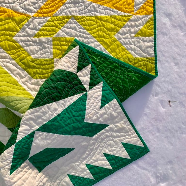 A vibrant quilt featuring geometric patterns in yellow, green, and white is displayed against a snowy background.