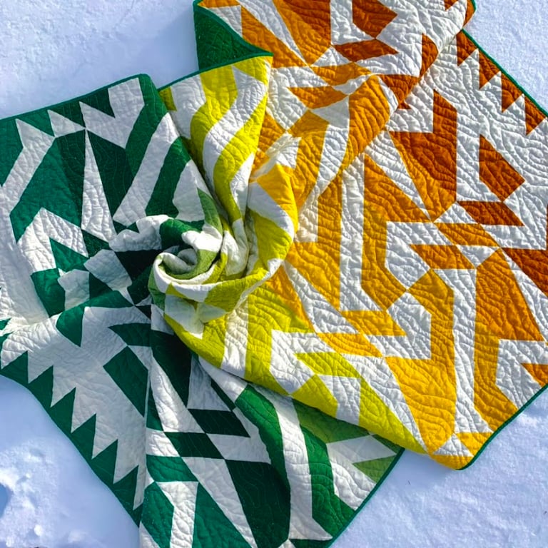 This image features two vibrant quilts with geometric patterns in green, yellow, and orange hues, showcasing the artistry of quilting.
