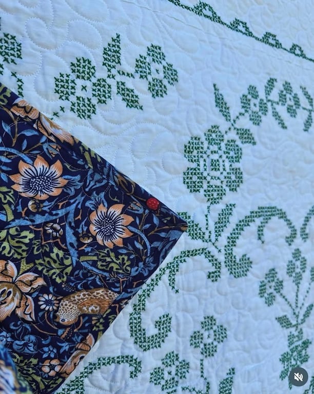 The image showcases a close-up of a beautifully quilted fabric featuring intricate floral patterns in green and white.