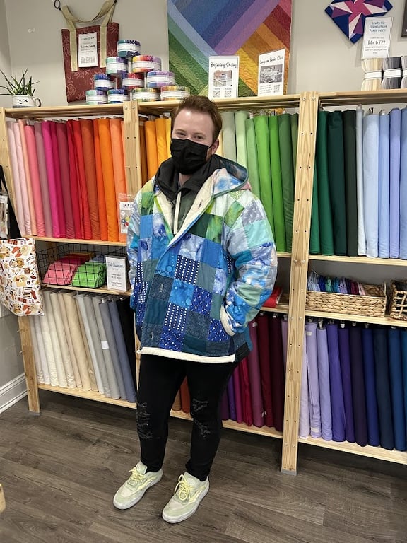 A person wearing a colorful patchwork jacket stands in front of vibrant fabric shelves at Cut and Sew PHL.
