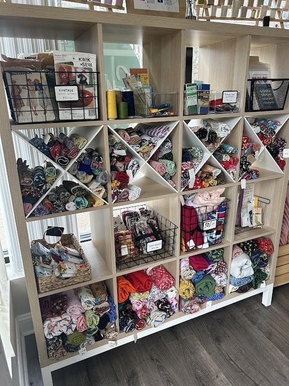The image showcases a well-organized shelving unit at Cut and Sew PHL, filled with colorful fabrics, sewing patterns, and supplies.