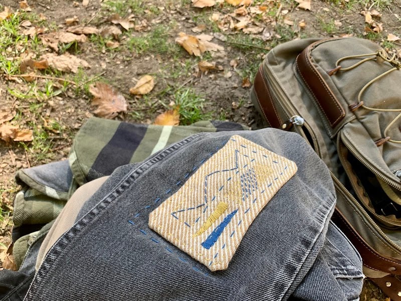 The image shows a close-up of a denim jacket with a decorative patch, surrounded by various fabrics and a backpack on the ground.