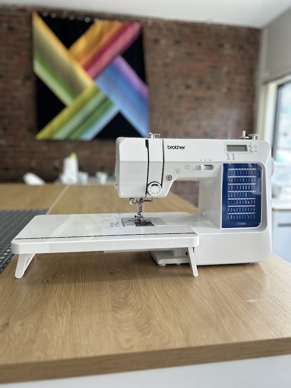 The image showcases a Brother sewing machine prominently displayed on a wooden table in a well-lit sewing store.