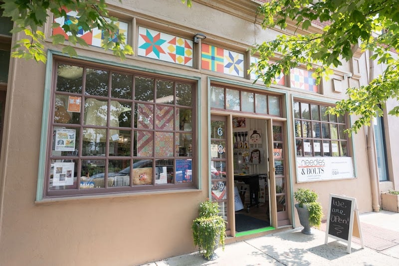 The image shows the exterior of Needles & Bolts, a sewing store, featuring colorful window displays with fabrics and quilting patterns.