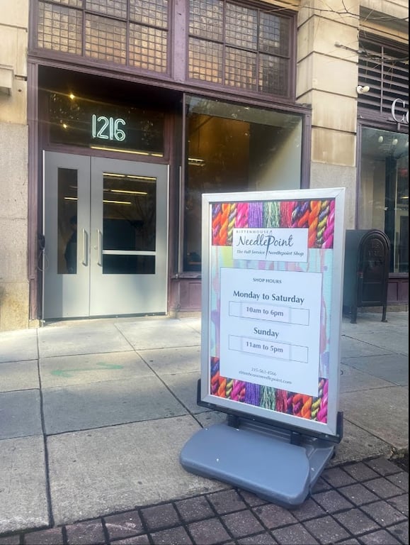 The image shows the entrance of Rittenhouse Needlepoint, a sewing store, featuring a welcoming sign with shop hours.